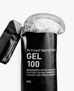 Gel 100 se ha desarrollado aprovechando la tecnología de hidrogel natural y está elaborado con seis ingredientes naturales. No contiene colorantes ni conservantes y viene en raciones de 40 g. Cada ración contiene un 60 % de carbohidratos, lo que representa una elevada relación peso-energía.